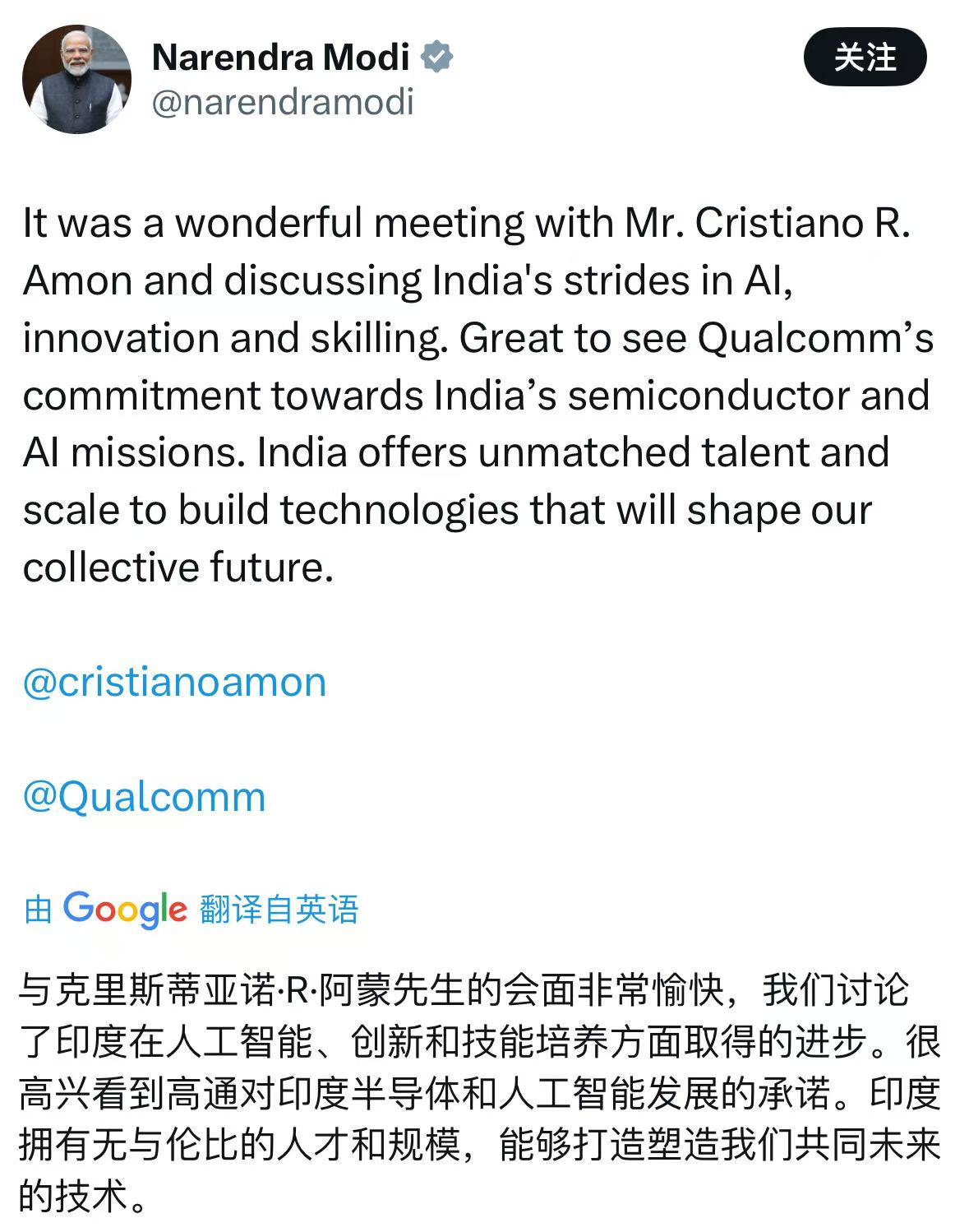 莫迪在则在X上回复表示,与Amon先生的会面非常愉快,我们讨论了印度在人工智能、创新和技能培养方面取得的进步。很高兴看到高通对印度半导体和人工智能发展的承诺。印度拥有无与伦比的人才和规模,能够打造塑造我们共同未来的技术。